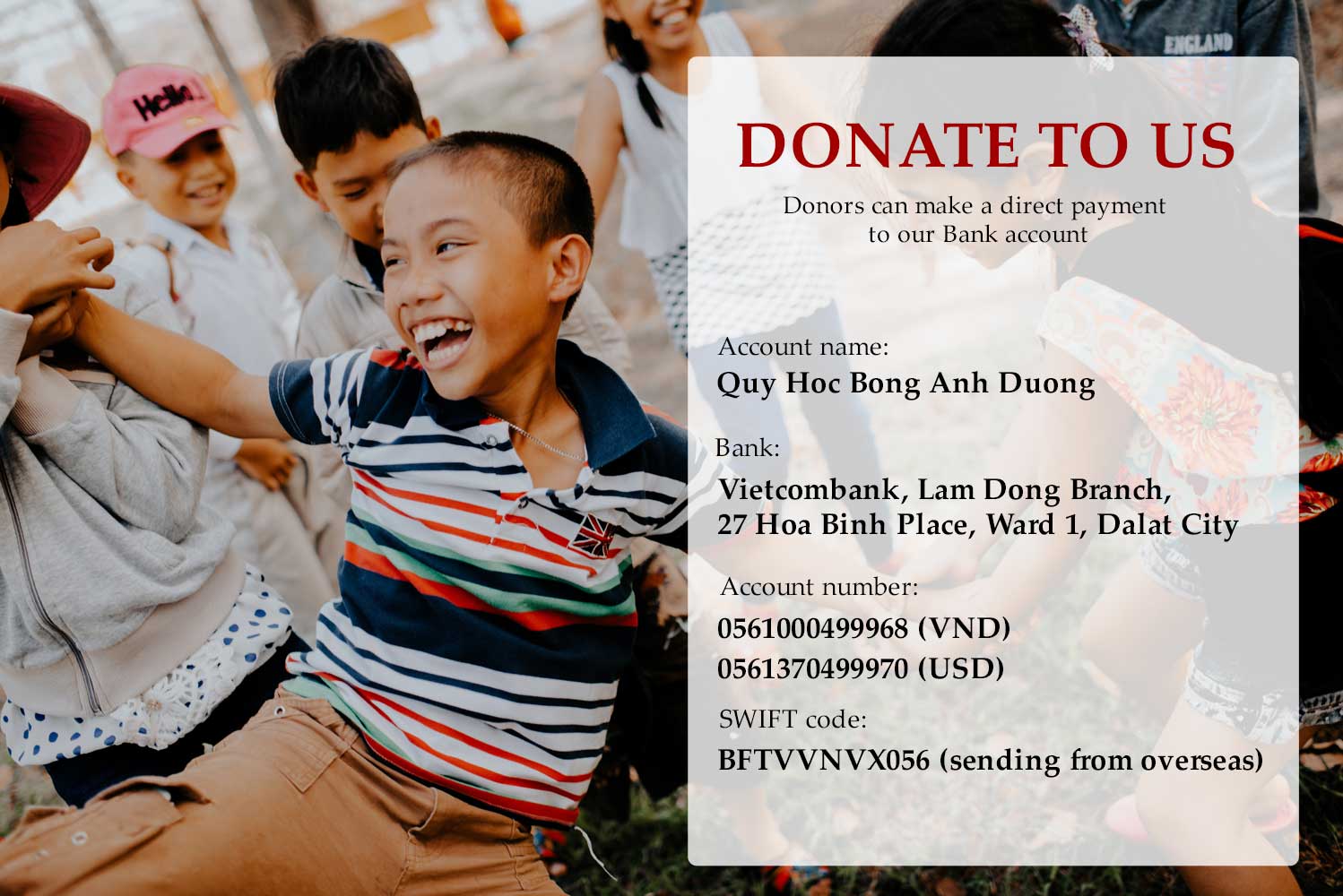 SF is a non-governmental, non-religious and non-profit education-oriented charity that helps disadvantaged children in Vietnam to get the most out of their education so they can build aspirations for a better future for themselves, their family and potentially generations to come.